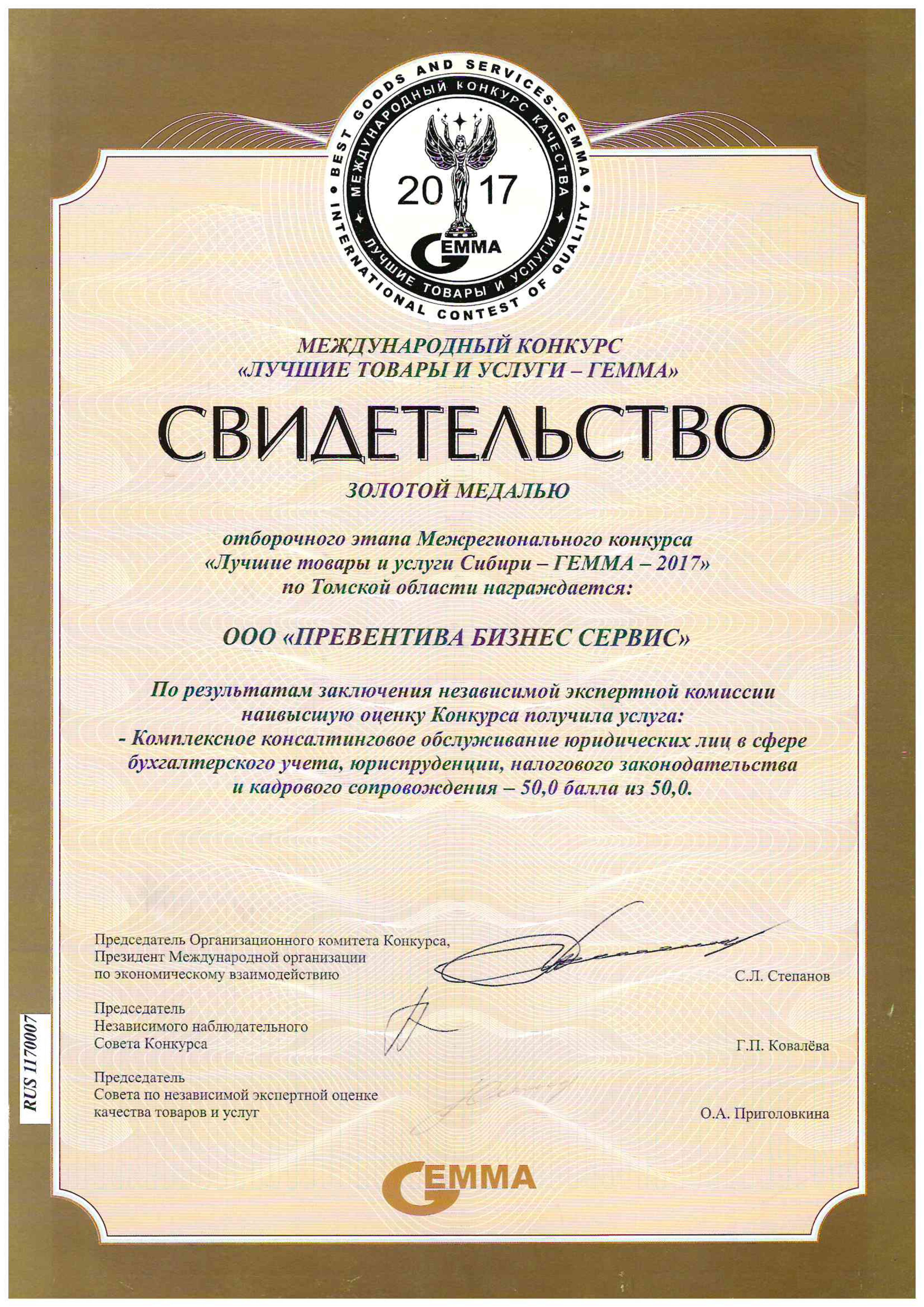 Конкурс «Лучшие товары и услуги Сибири — Гемма» — это межрегиональный проект, реализуемый под патронажем Межрегиональной ассоциации «Сибирское соглашение». Конкурс «ГЕММА» проводит работу с 2002 года на территории 60 регионов России и 64 стран мира в том числе и в Томской области. «Превентива» в 2004 году была награждена золотой медалью за лучшие товары и услуги Сибири по Томской области, получив наивысшую оценку 53,75 из 60 баллов за консультационно-юридическую помощь налогоплательщикам.